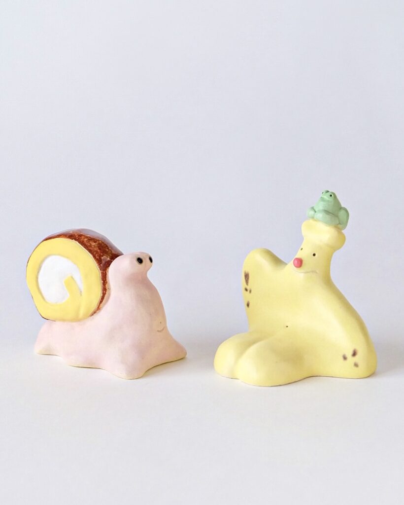 犬やカタツムリ、もぐらや蝶々のような生き物を始め、バナナやりんごなど私たちの身近なくらしの中にあるものをモチーフに、現実には存在しないユニークなキャラクターたちのオブジェを販売します。
