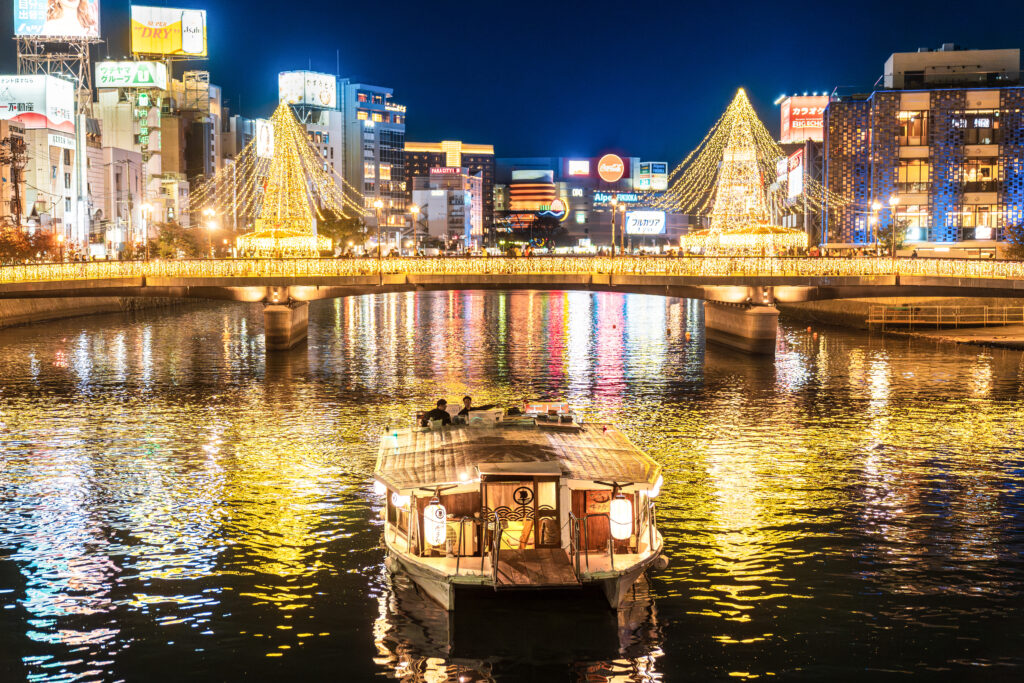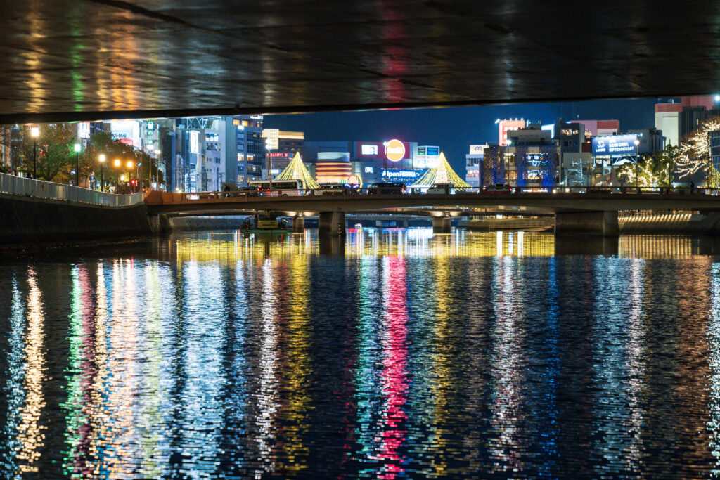 中洲のランドマーク「であい橋」を中心に、冬の恒例となった美しいイルミネーションが今年も点灯しています。