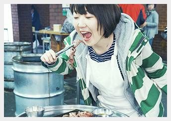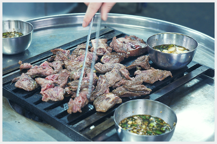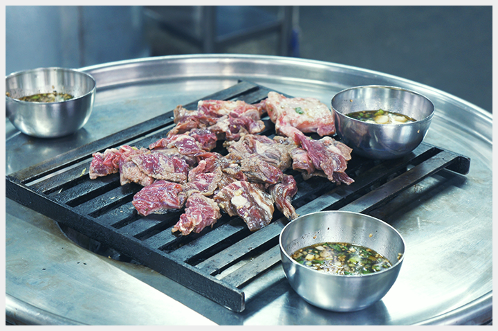 1件目はドラム缶で焼き肉を食べることができるソソモンヌンカルビチッ。直訳すると「立って食べるカルビ屋」という意味で、文字どおり椅子はなく、立ち飲み感覚で焼き肉を食べることができます。メニューはカルビのみ! (なんと潔い!)持ち場のドラム缶(笑)の前に案内されると人数分のカルビがドカン!と運ばれてきます。地元の方も沢山居て、現地の空気も楽しめますよ。