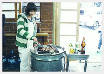 やっほー!肉だ肉だ!焼き肉だー!ドラム缶の前で肉を焼く姿はシュールです(笑)