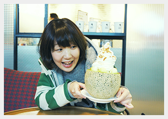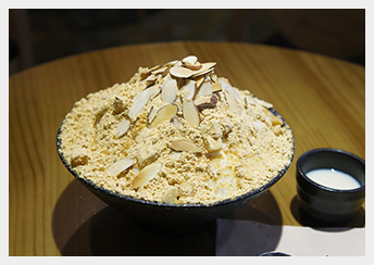 釜山発のスウィーツ「ソルビン(雪氷)」細かく溶けにくい氷で作ったかき氷にたっぷりきな粉がかかった今人気のスウィーツです。店内は広く、基本セルフ式なので気軽に立ち寄れる雰囲気。