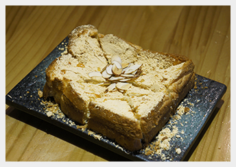 下の氷が見えないくらいのたっぷりきな粉とアーモンド。そしてみんな大好き練乳をかけて頂きます。口にいれるとむせてしまうくらいのきな粉!(笑)練乳が絶妙な甘さのバランスを保ち美味しいです!小さくカットされたお餅がものっているので食感も楽しめます。調子にのって2番人気のインジョルミトーストも注文♡